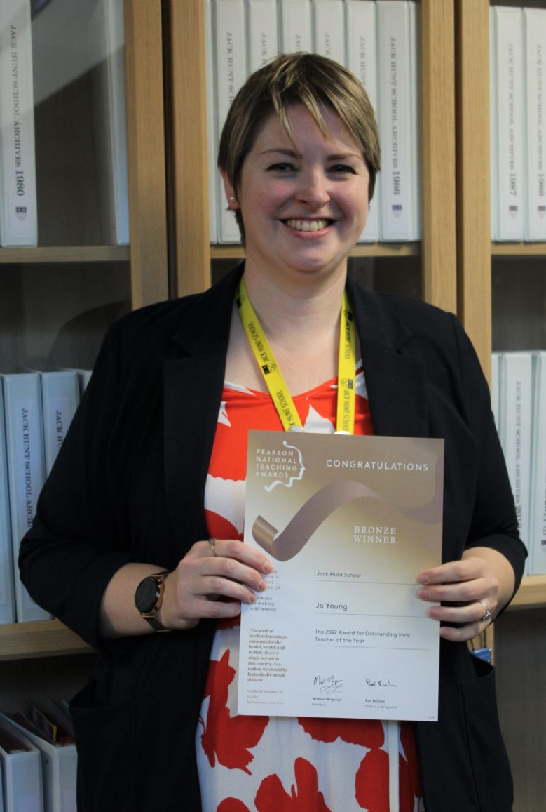 The Bronze prize for ‘Outstanding New Teacher of the Year’ was given by Pearson’s National Teaching Awards, sponsored by the Department for Education. Ms Pamela Kilbey, Headteacher of Jack Hunt School said, ‘We are extremely proud of Dr Young. This is an incredible achievement at the beginning of her teaching career’.