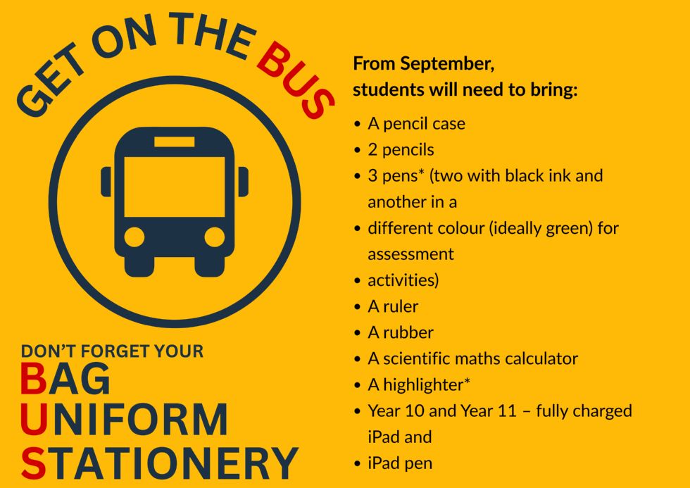 Here's a helpful reminder of what students will need to bring with them when they start back at Jack Hunt Academy this September