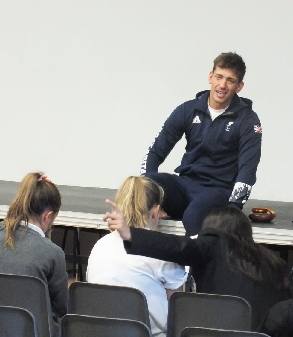 The students were very enthusiastic in their question and answer session including asking James “who were your PE teachers when you were at Jack Hunt?”, “when you were younger did you think you would be a Gold medallist?” and “when you were at school which sports did you take part in?”. James' responses were “Mr Game was one of them” - he's now Assistant Headteacher; “I always thought I would be successful in a sport” and “I took part in all sorts of sports that we could do at the school”.
