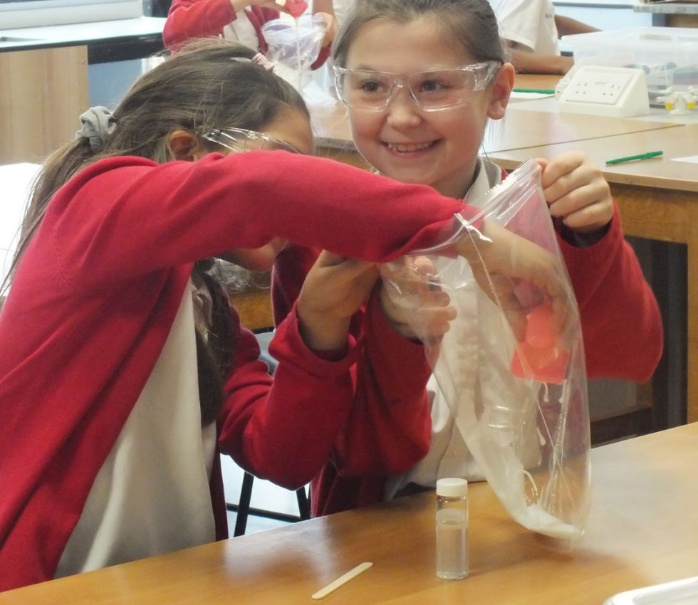 Last Wednesday afternoon, we welcomed 60 Year 4 pupils from Highlees Primary School who had come in as part of their ‘potions’ topic to find out more about working in a Science Lab and to have some fun carrying out some experiments.  The session started with Jack Hunt science teachers Mrs England, Mr McAlpine and Miss Ward, creating smoky potions with coloured water and a secret ingredient!!!  Armed with protective googles and working in pairs, the pupils went on to do more experiments including making a ball from PVA Glue and liquid Borax and creating a sugar density rainbow using sugar water and colouring.  Mrs England ended her session with the students lighting gas bubbles as they floated to the ceiling which was greeted with lots of ‘oohs’ from the children.