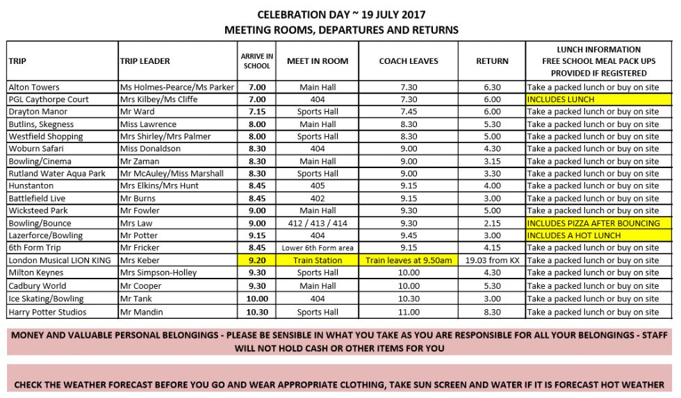 Below are the Meeting Rooms, Departures and Returns for Celebration Day